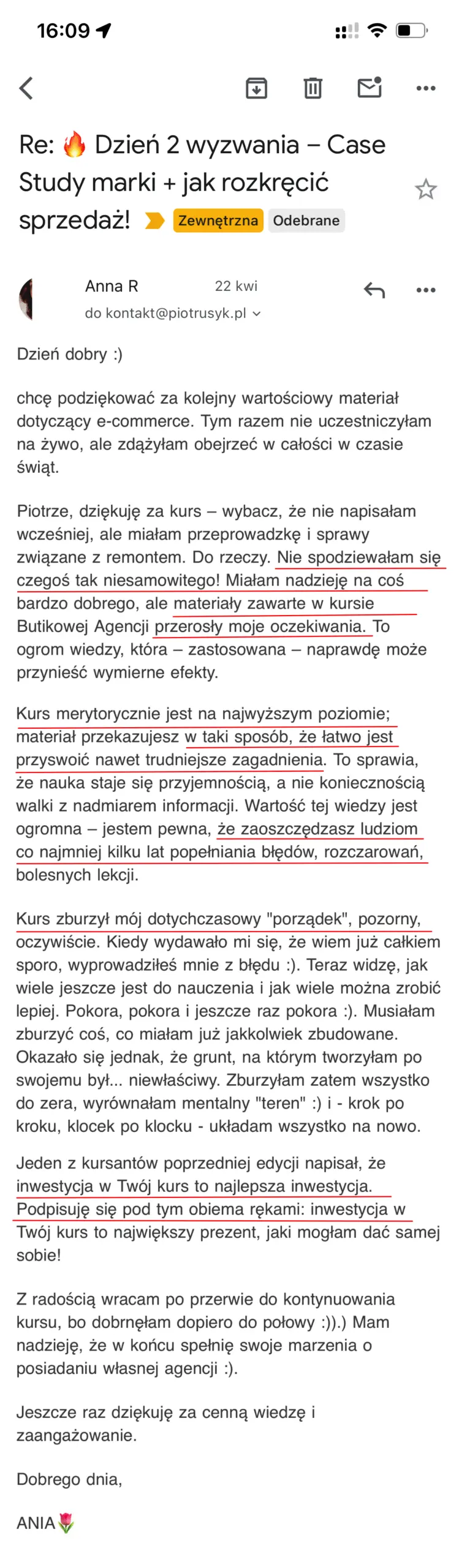 Masz dostęp do wsparcia na platformie pod każdą lekcją + możesz zadać pytanie na live’ie i Discordzie. Nie jesteś sam, pomagam Ci dowieźć wynik.